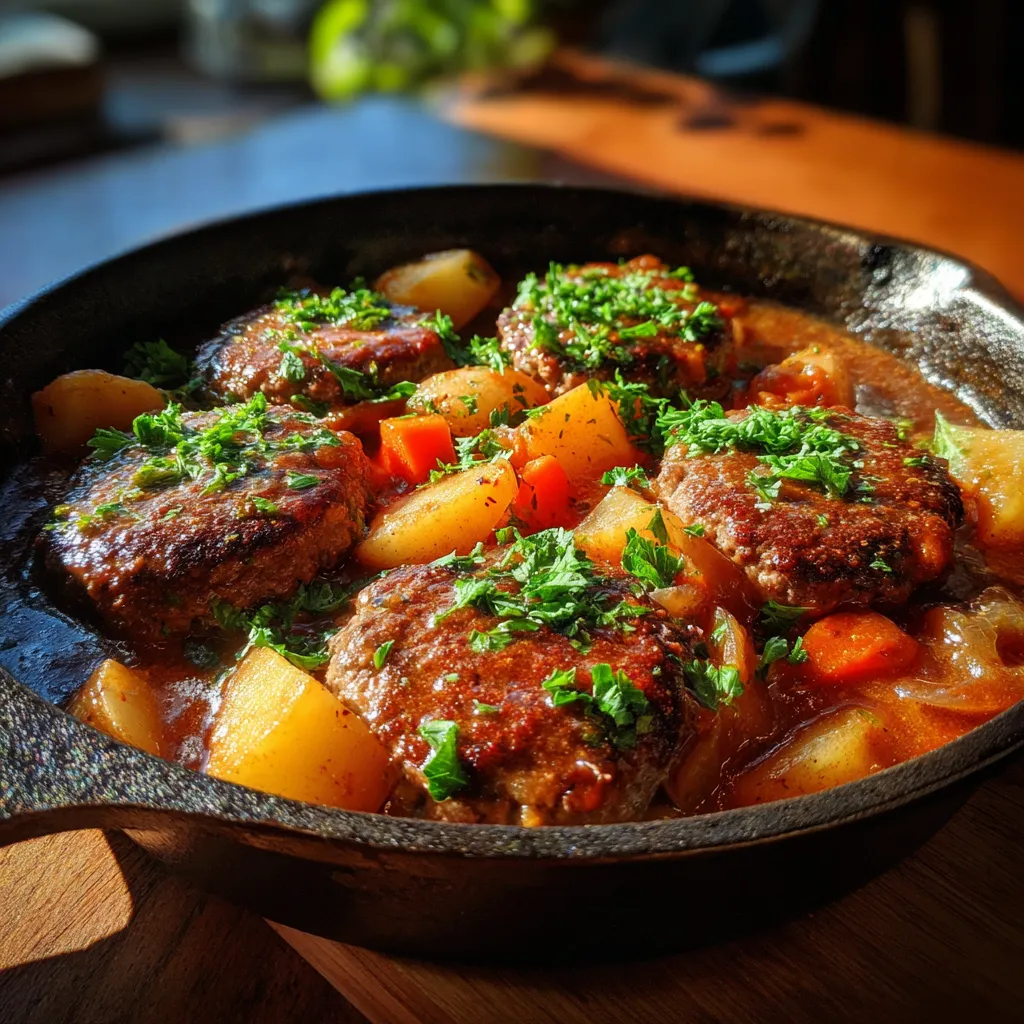 - Step 5 Return the seared hamburger patties to the skillet, nestling them into the gravy. Add the potato chunks around the patties.