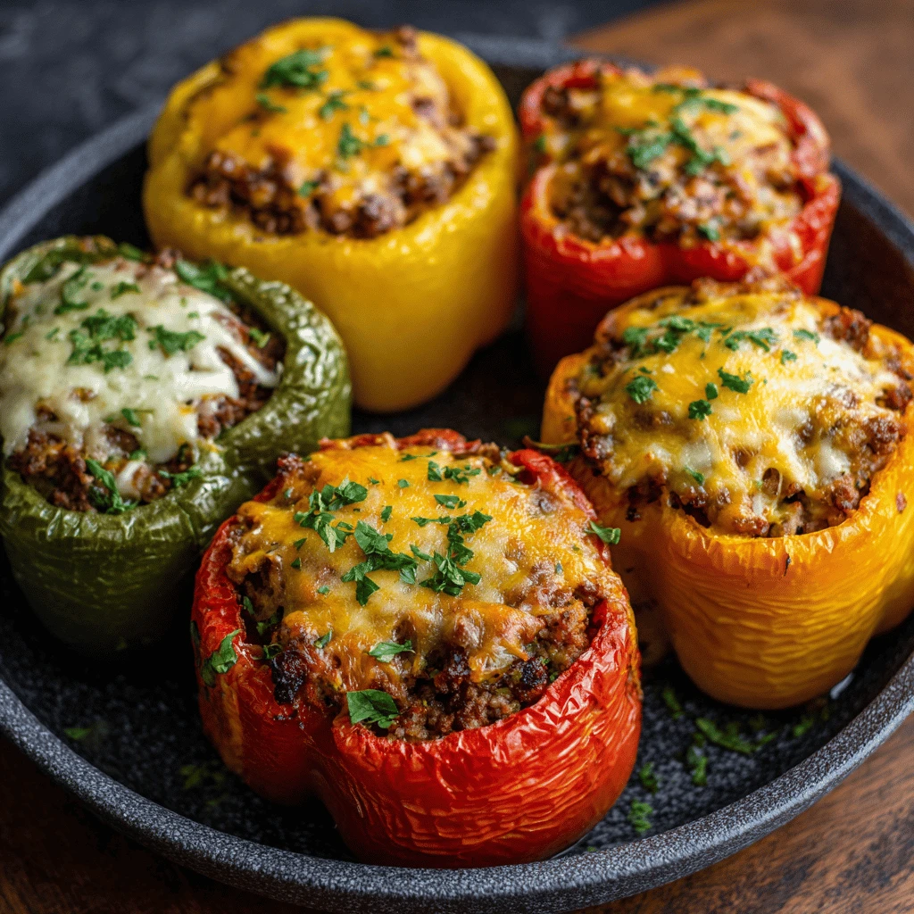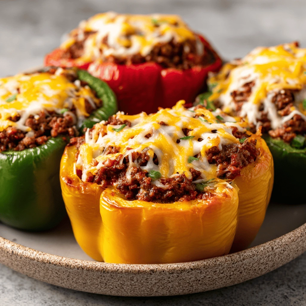 8. Stuff the peppers: Spoon the ground beef mixture into each of the prepared bell peppers, filling them to the top.