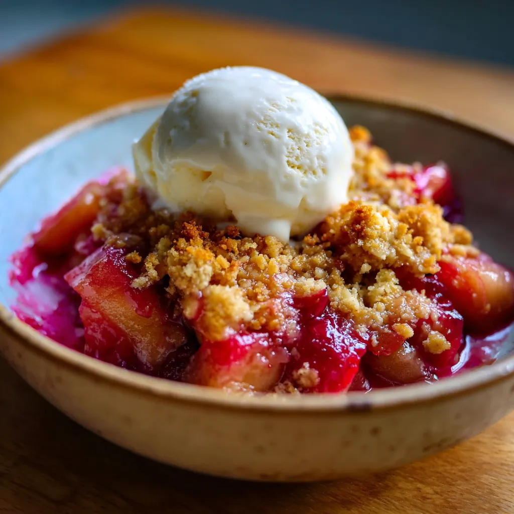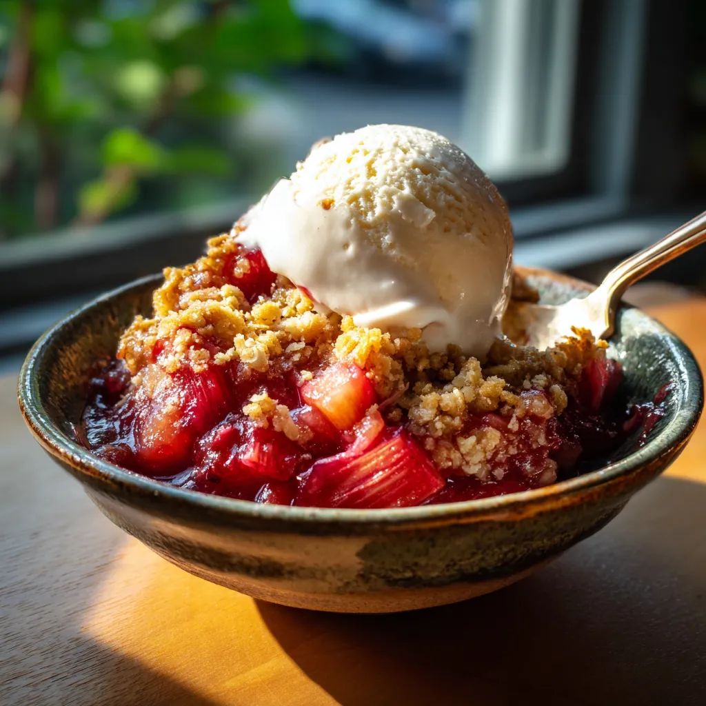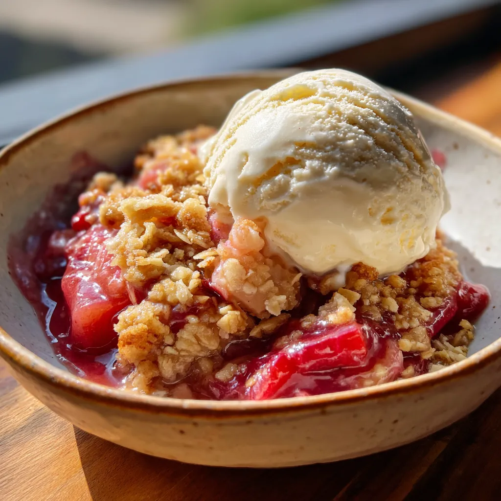 - Beautiful Presentation: The vibrant pink and red hues of the rhubarb peeking through the golden crumble topping create a visually appealing dessert that looks as good as it tastes.