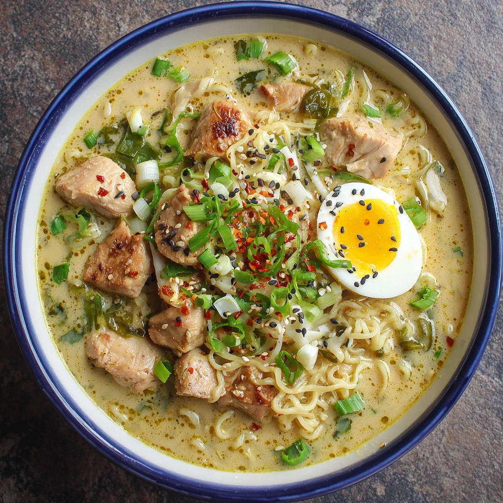 This creamy garlic chicken ramen elevates the classic dish. It is a rich and flavorful experience.