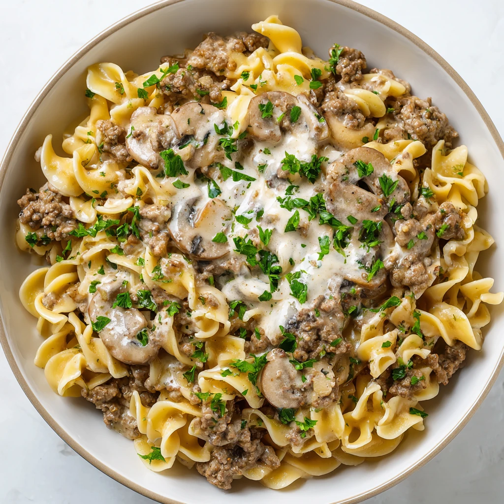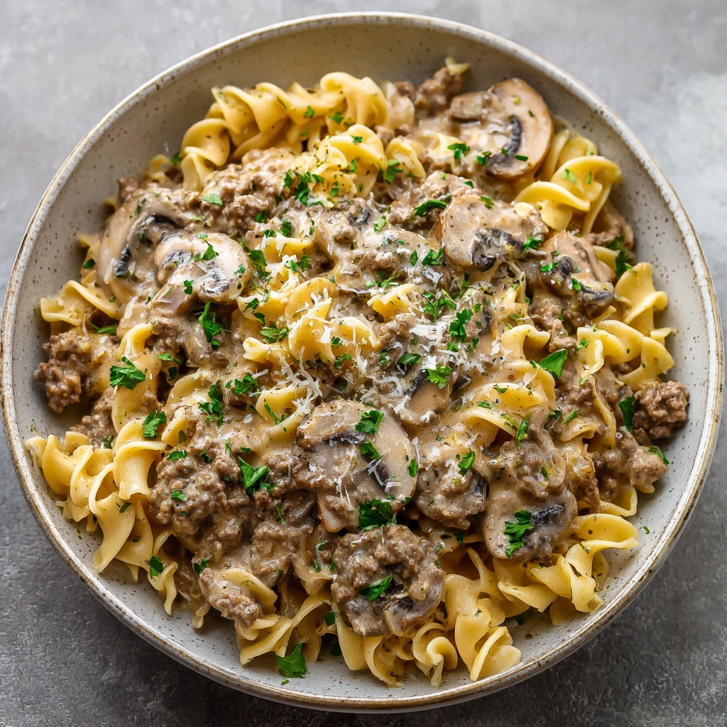 Stroganoff is a dish traditionally made with beef strips in a creamy sauce. This version uses ground beef, which is a budget-friendly and convenient substitute.