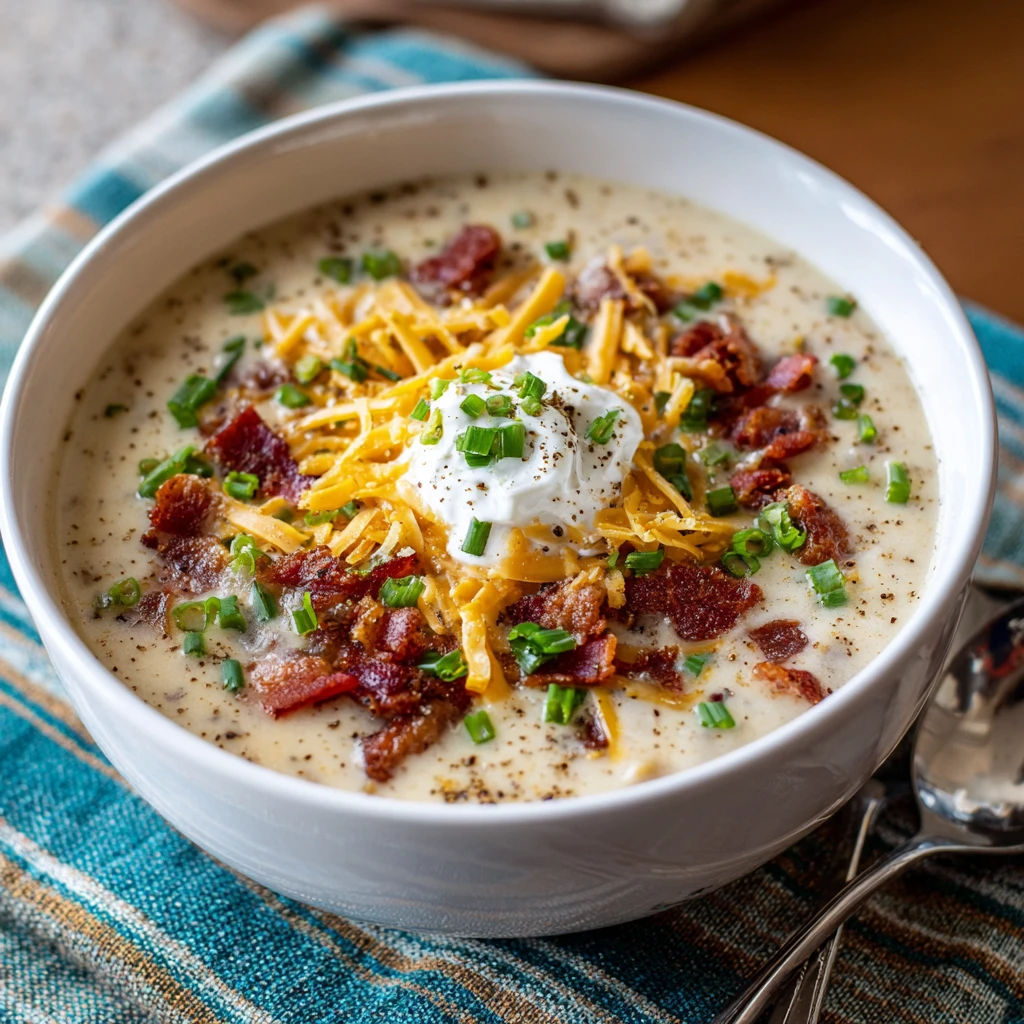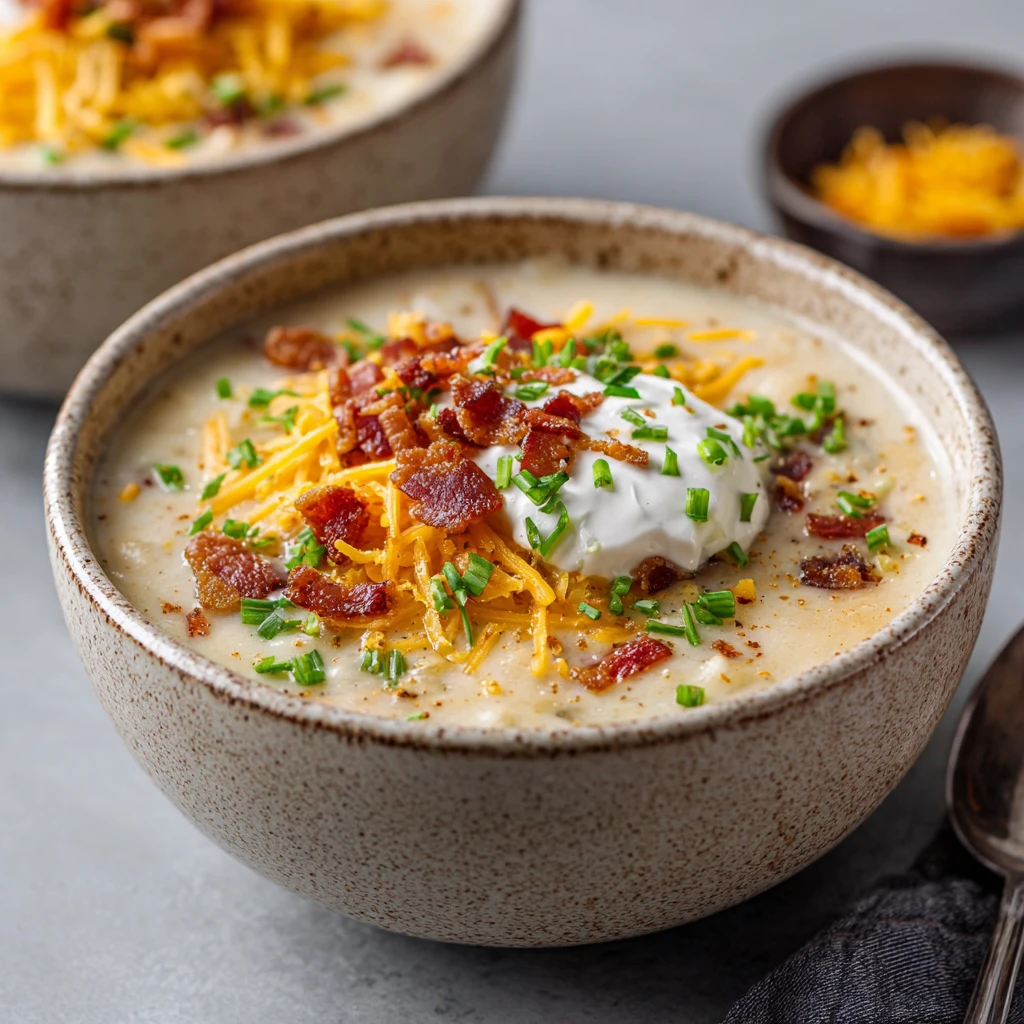 10. Ladle the soup into bowls and top with additional cheddar cheese, bacon, green onions, and sour cream.