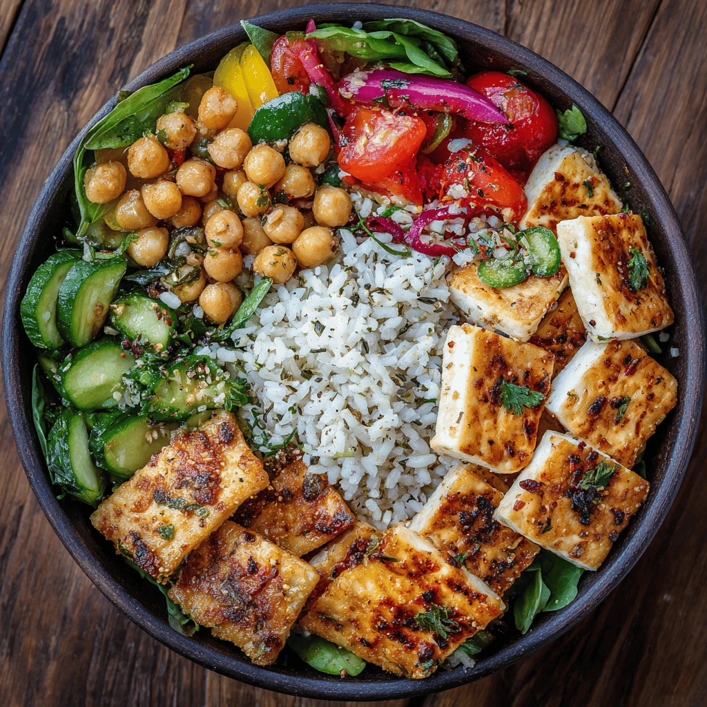3. Tofu Centerpiece: Place the cooked tofu in the center of the bowl.
