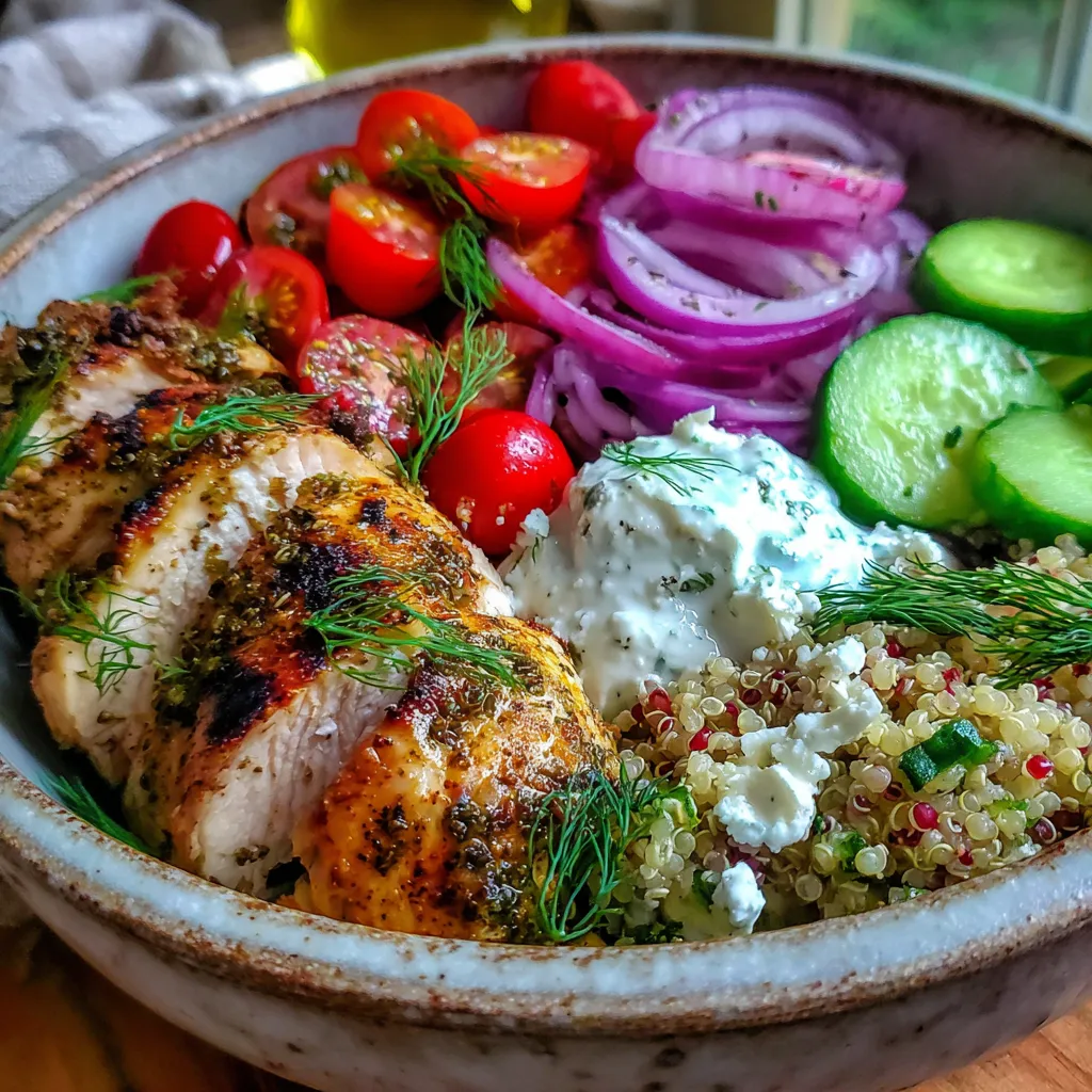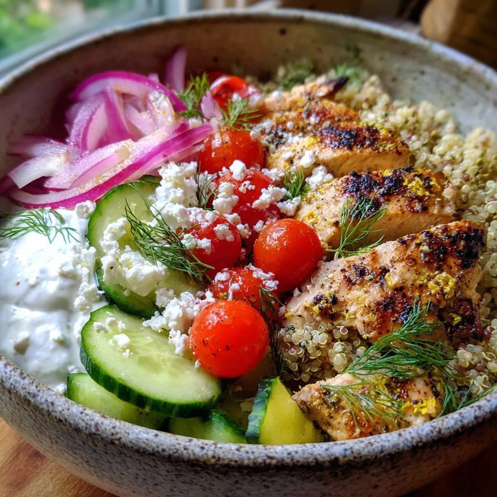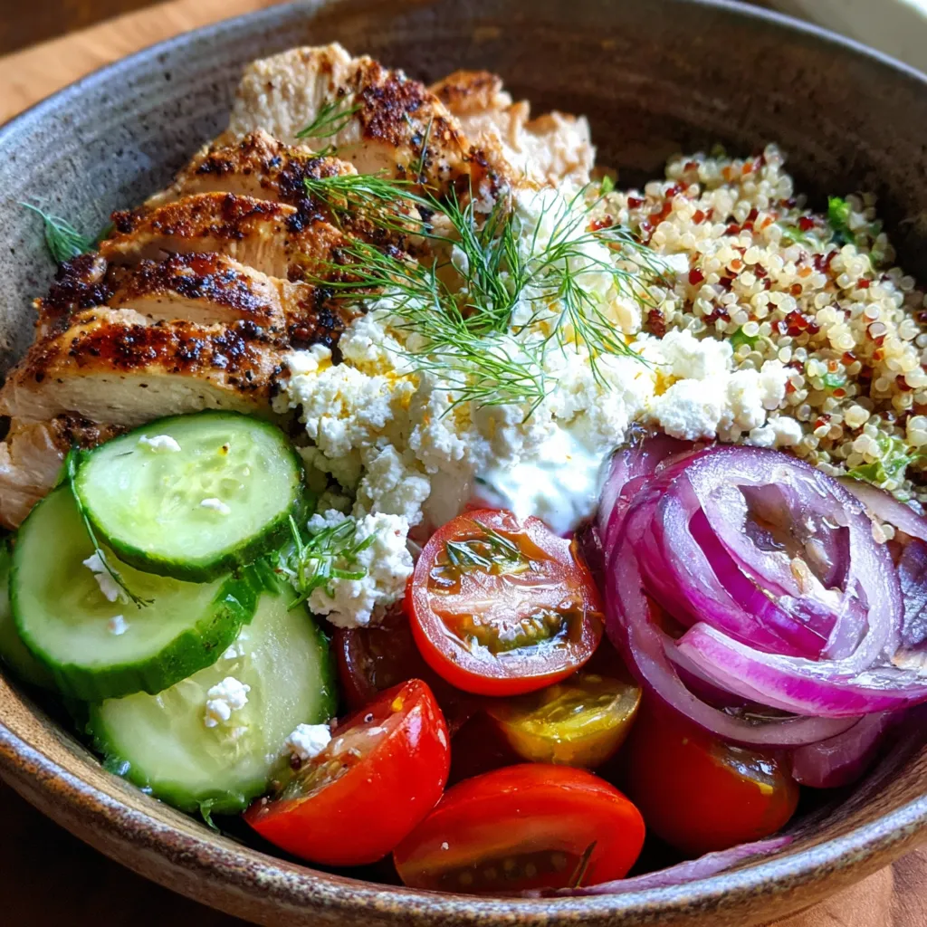 - Step 4 4. Assemble Bowls: Divide cooked rice or quinoa among serving bowls. Top with cooked chicken, diced cucumber, halved cherry tomatoes, sliced red onion, crumbled feta cheese, and Kalamata olives.