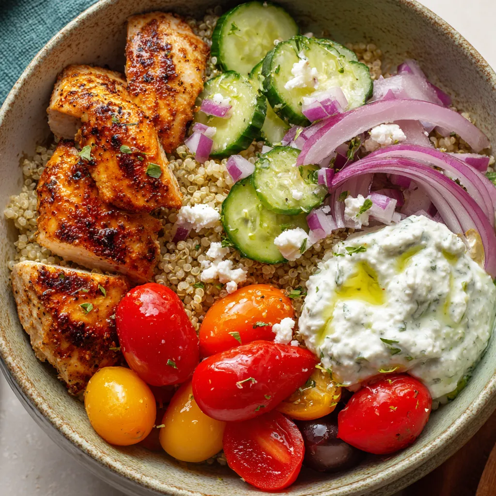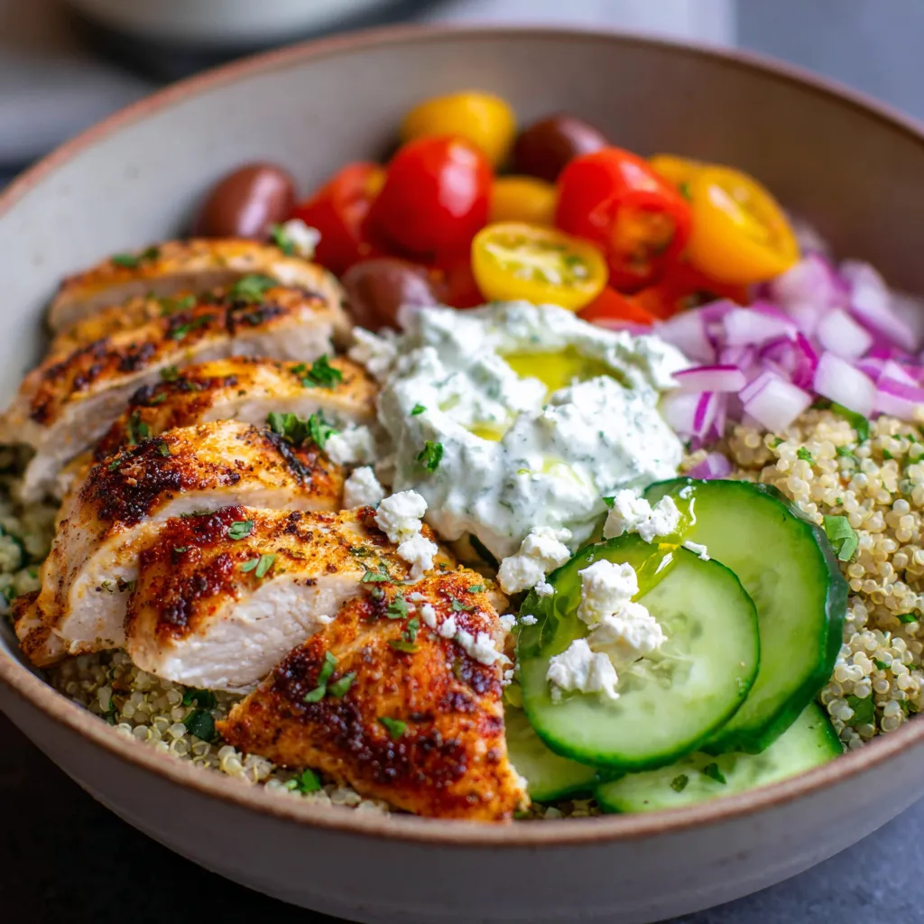 - Separate Components for Meal Prep: To prevent soggy bowls, always store your dressing (tzatziki or vinaigrette) separately. Keep the hot components (chicken) and cold components (veggies) separate until just before serving if possible, especially if you plan to reheat the chicken.