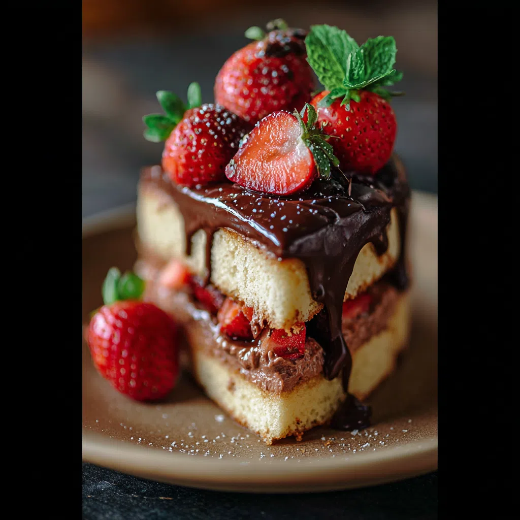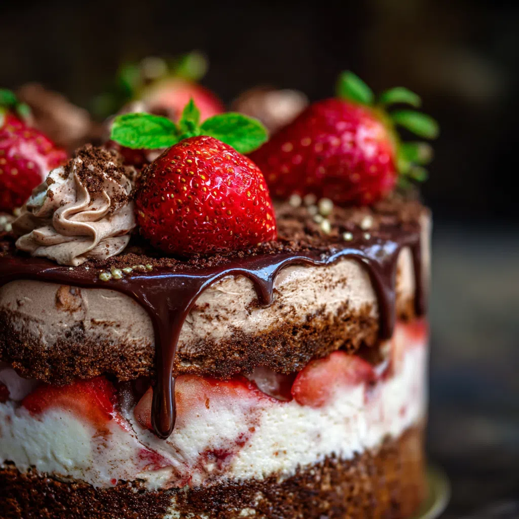 The star ingredients of this cake are the fresh strawberries and high-quality dark chocolate, which provide a deep, velvety flavor and a burst of juicy sweetness in each bite.