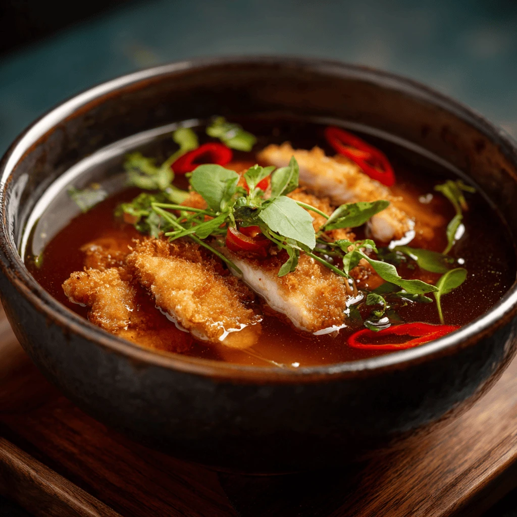 Adding the Crispy Chicken: Cut the crispy chicken into bite-sized pieces and gently add them to the broth just before serving. Adding them too early will cause the breading to soften.
