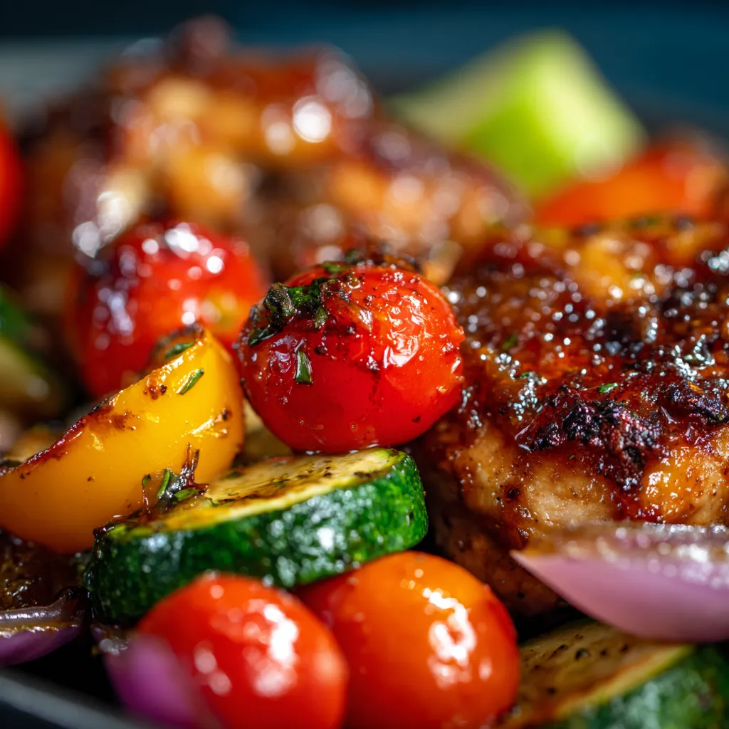 balsamic glazed chicken close-up with vibrant vegetables
