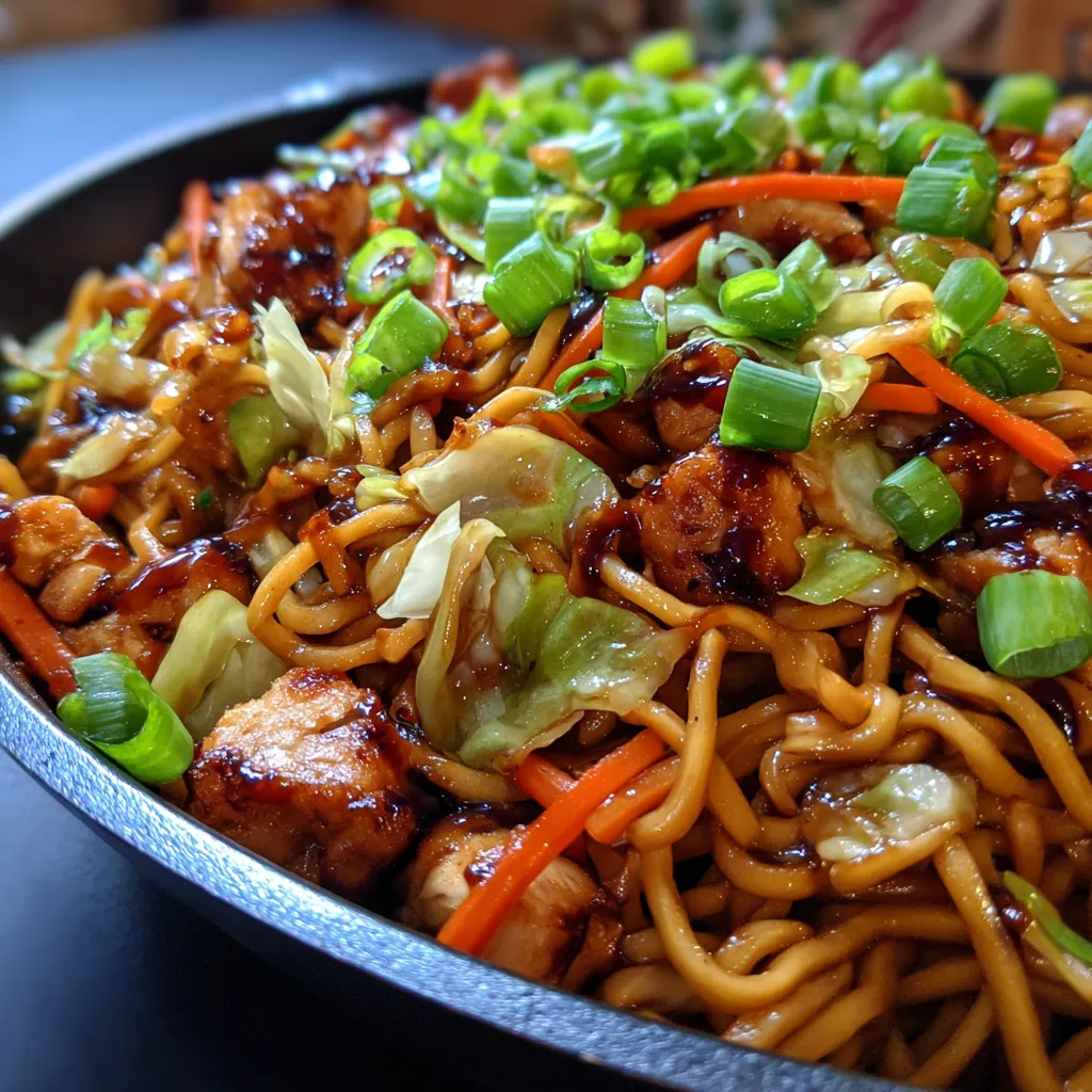 • Step 5 5. Return chicken (if using) to the pan. Add the cooked noodles and chopped green onions. Pour the prepared sauce over everything.