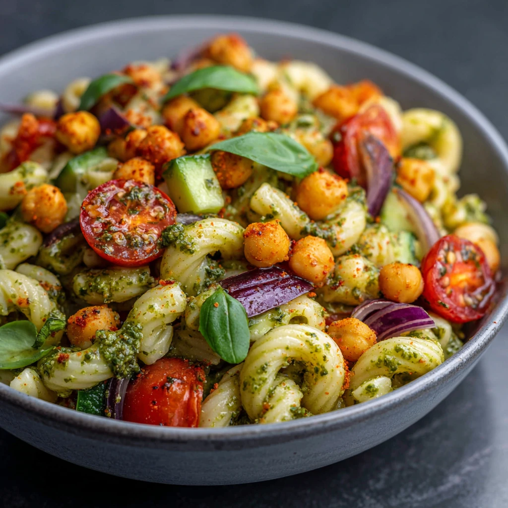 Yes, you can. It’s best to cook the pasta, roast the chickpeas, and chop the vegetables ahead of time, storing them separately. For optimal freshness and texture, combine all ingredients with the pesto just a few hours before serving or when you’re ready to eat. This helps prevent the pasta from getting too dry and the chickpeas from losing crispness.