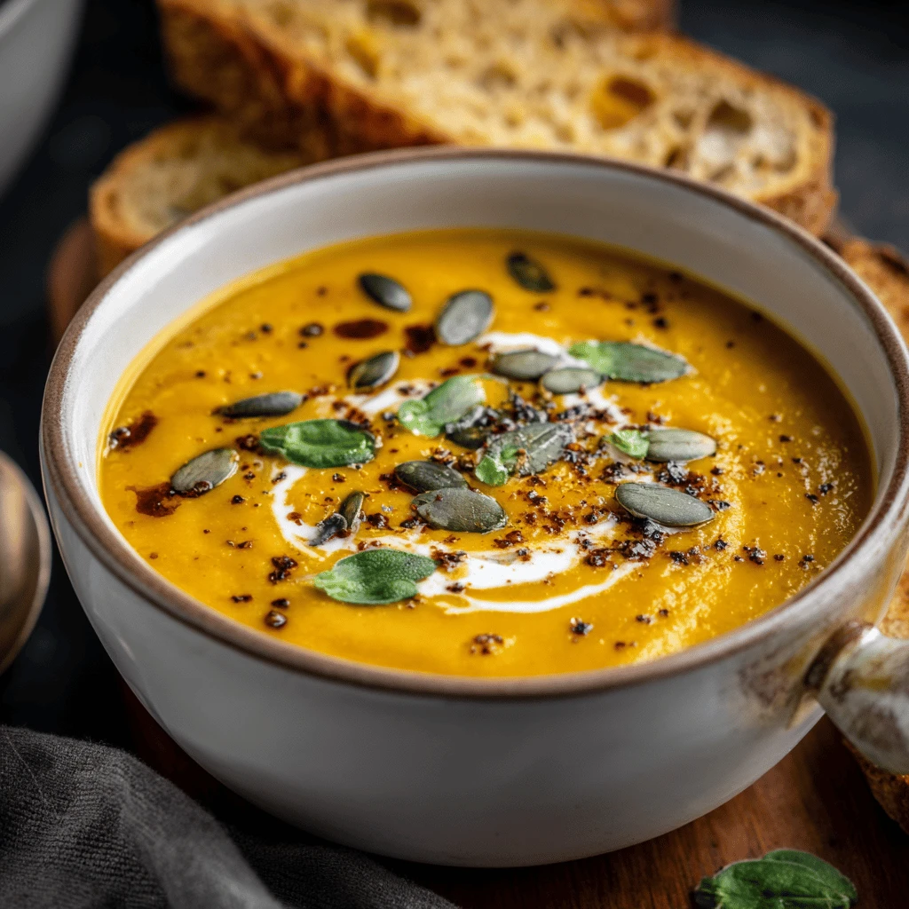 • Garnish: Top with toasted pumpkin seeds, croutons, chopped herbs, a swirl of cream, or a drizzle of olive oil.