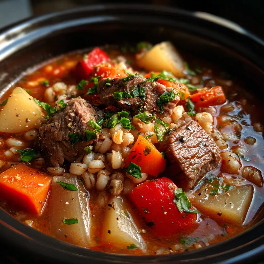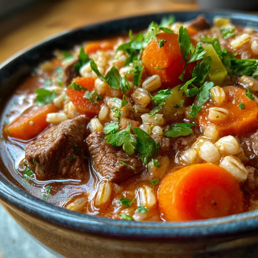 • The tender chunks of beef and the slightly chewy barley create a delightful texture combination.