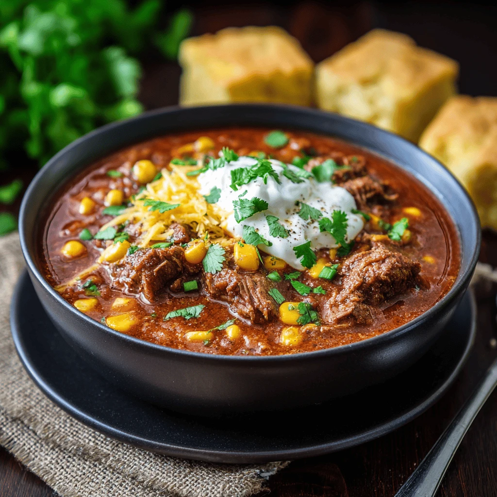This smoky beef and corn chili is perfect for a crowd or a cozy night in. Serve it in bowls with your favorite toppings and a side of cornbread or tortilla chips.
