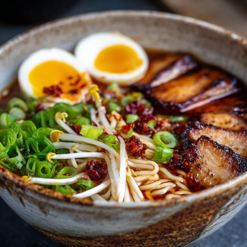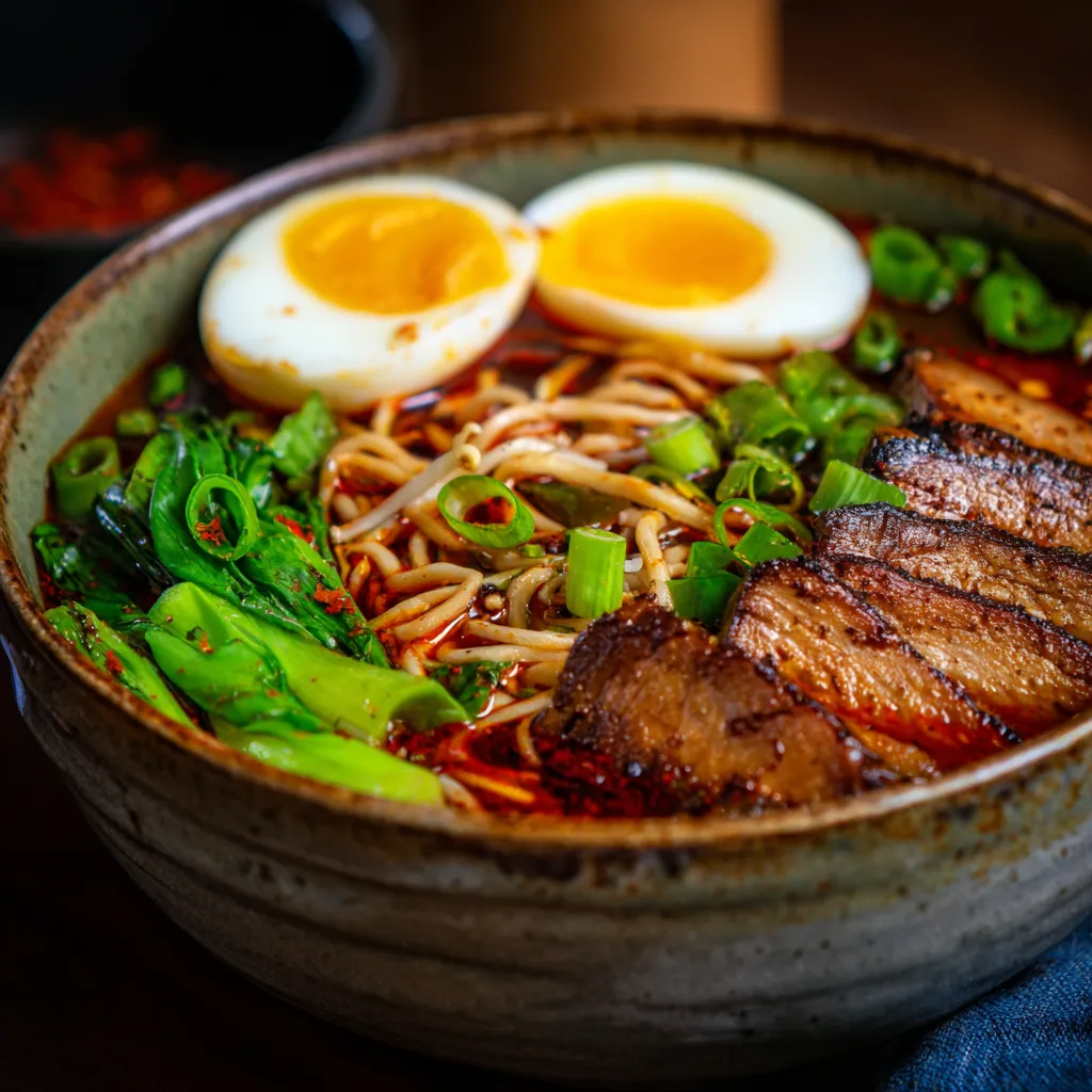 - Step 6 Top each bowl with soft-boiled eggs, sliced pork belly (if using), mushrooms, spinach, and fresh scallions. Drizzle with extra chili oil if desired. Serve immediately.