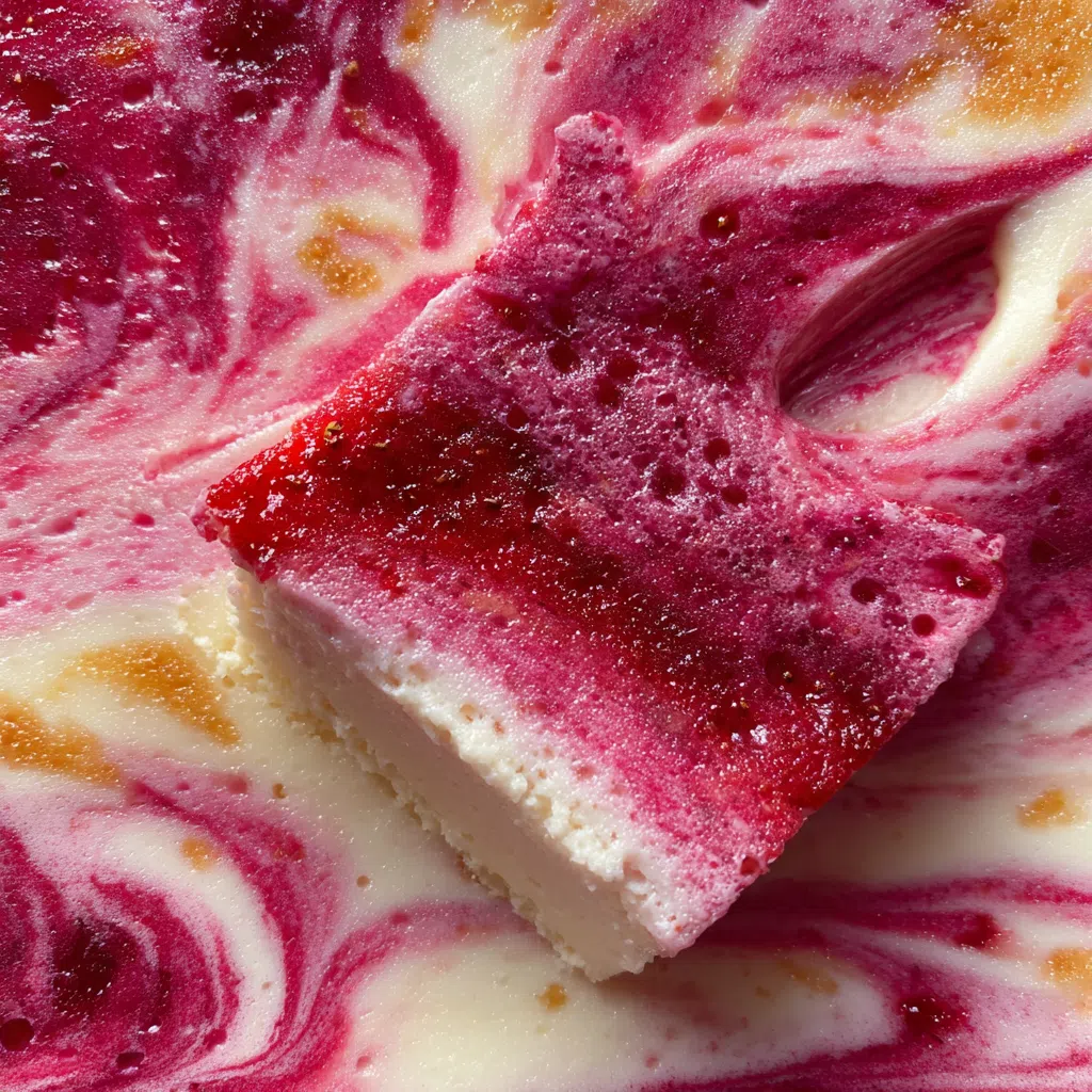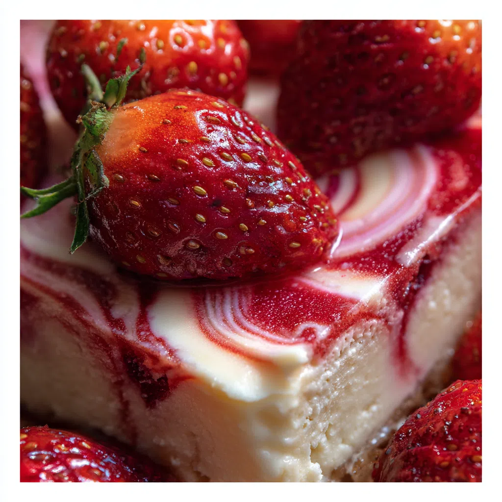 • The velvety cheesecake is swirled with a vibrant strawberry sauce, creating a stunning marbled effect.