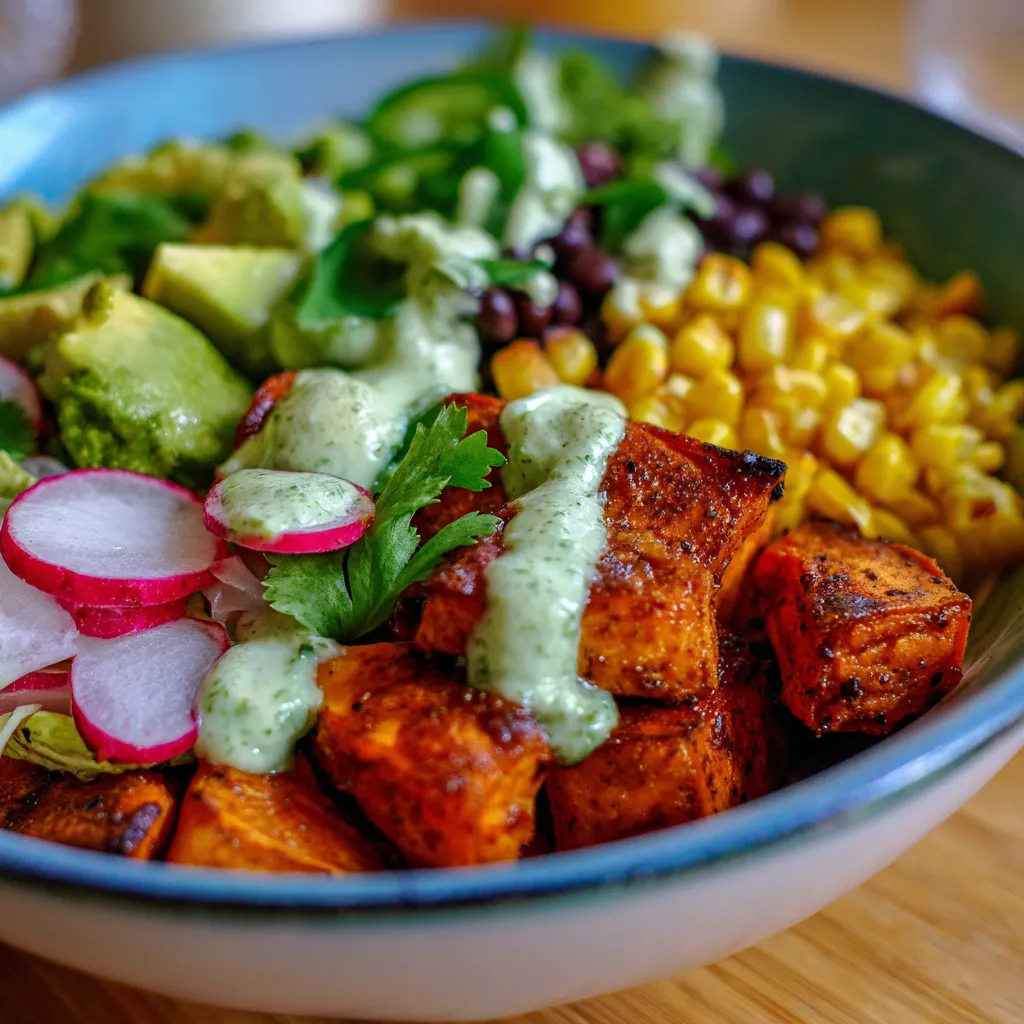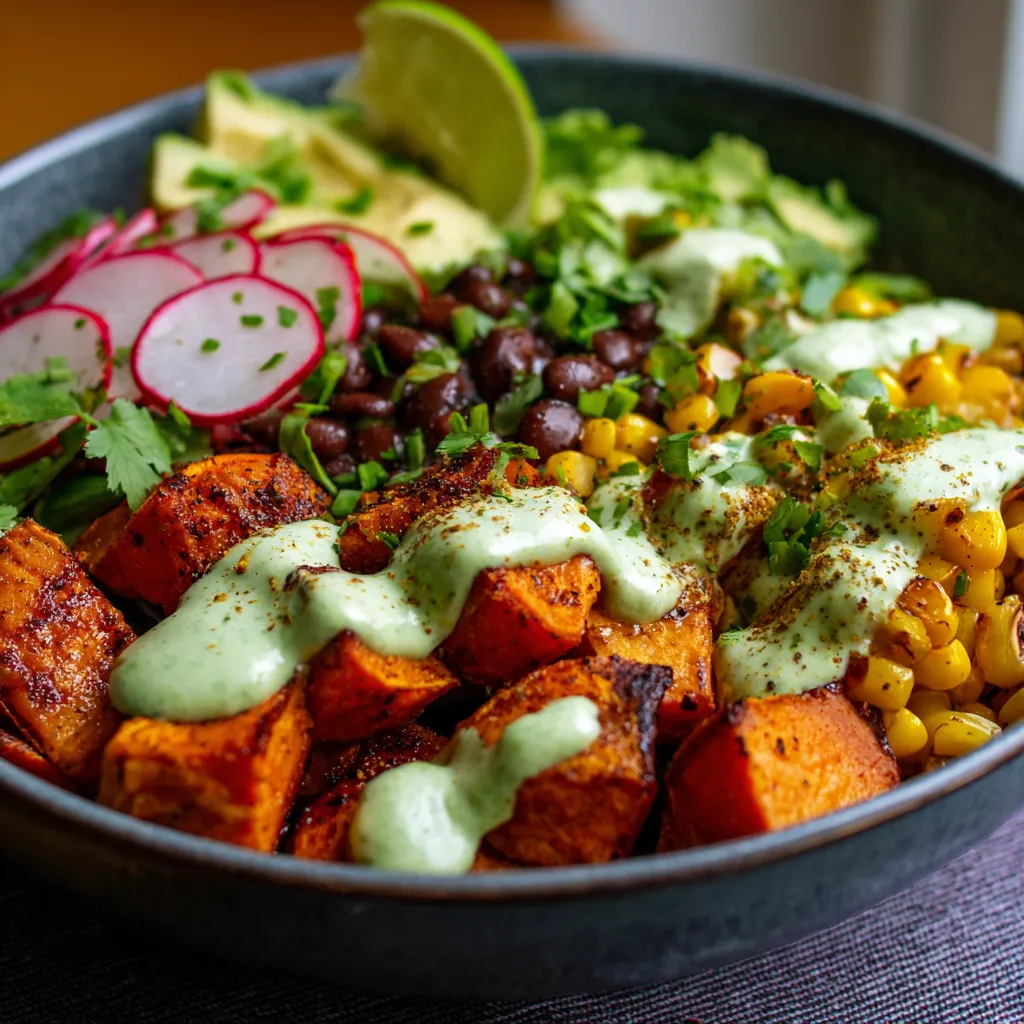 - Step 4 Assemble bowls: Place a base of cooked rice or quinoa. Top with roasted sweet potatoes, seasoned black beans, corn, avocado, red onion, and fresh cilantro. Drizzle generously with creamy lime sauce and serve with extra lime wedges.